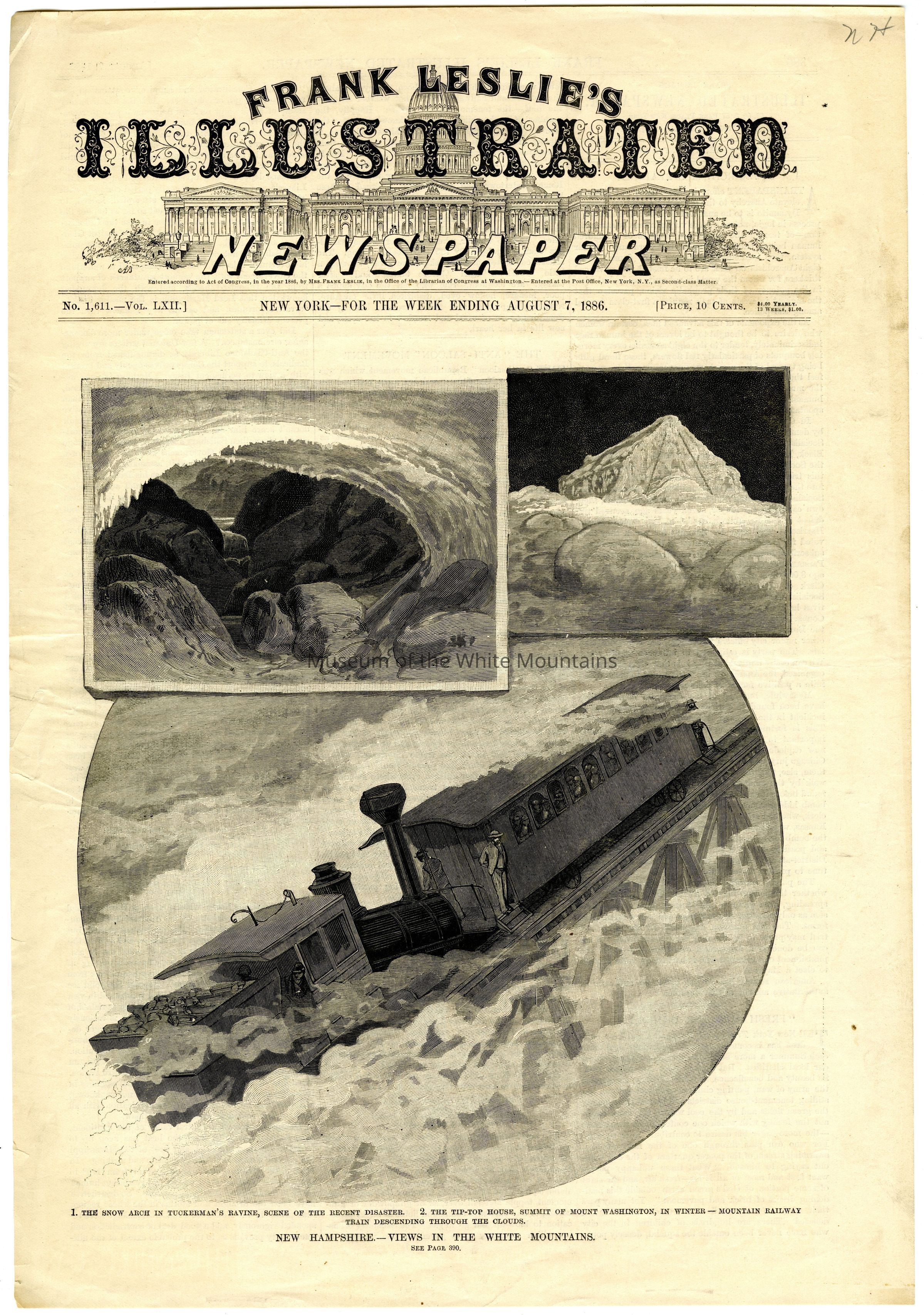 A page out of an issue of Frank Leslie's Illustrated Newspaper from August 7, 1886. The front contains three engraved images depicting: 1. The snow arch in Tuckerman's Ravine, scene of the recent disaster. 2. The Tip-Top House, summit of Mount Washington in winter. 3.Mountain Railway Train descending through the clouds.Type of Print