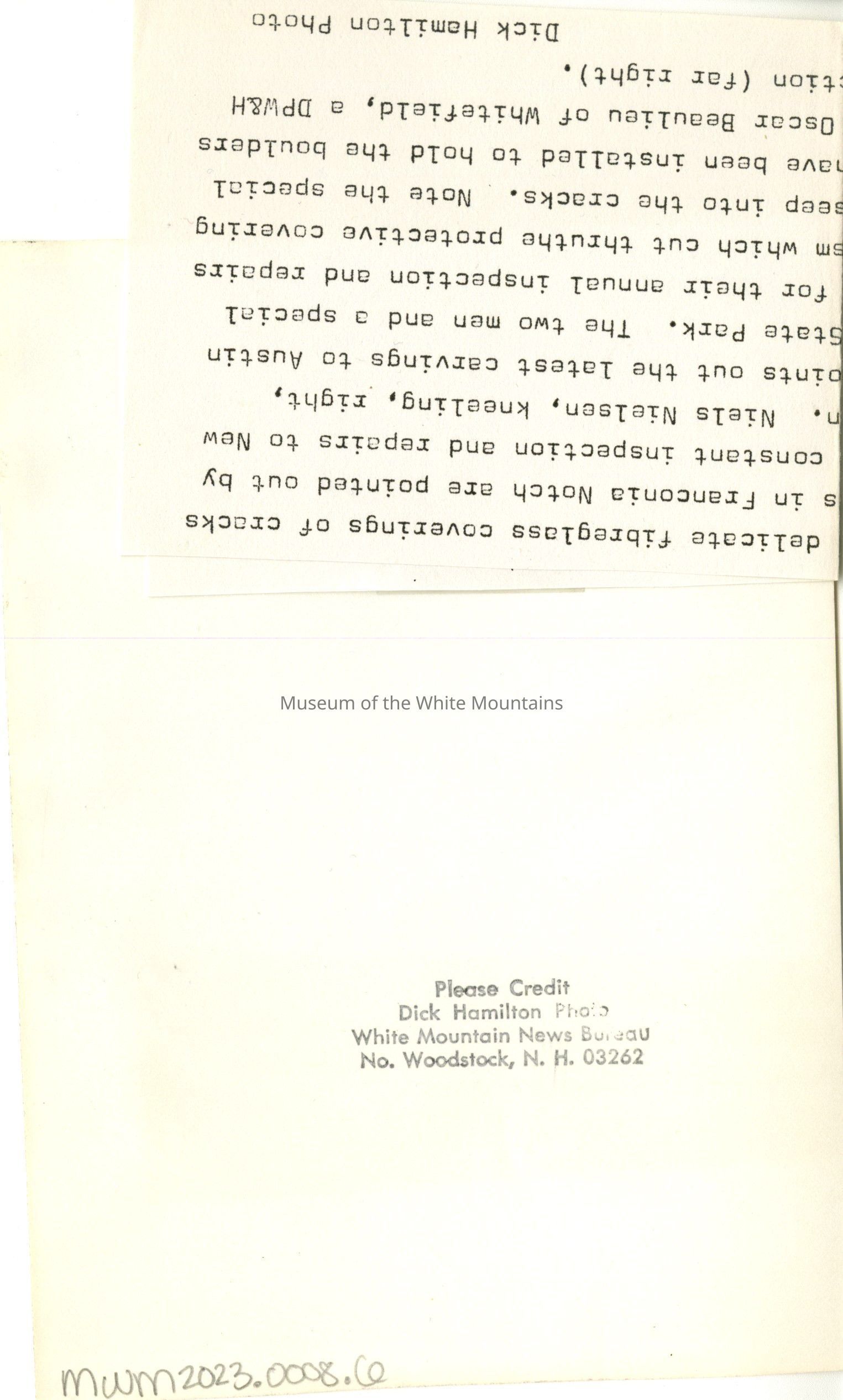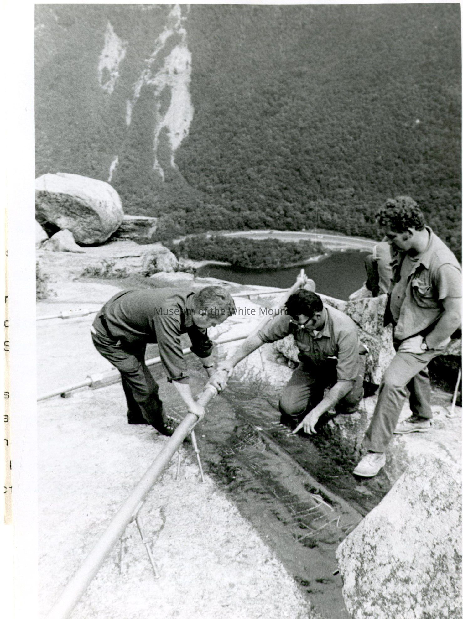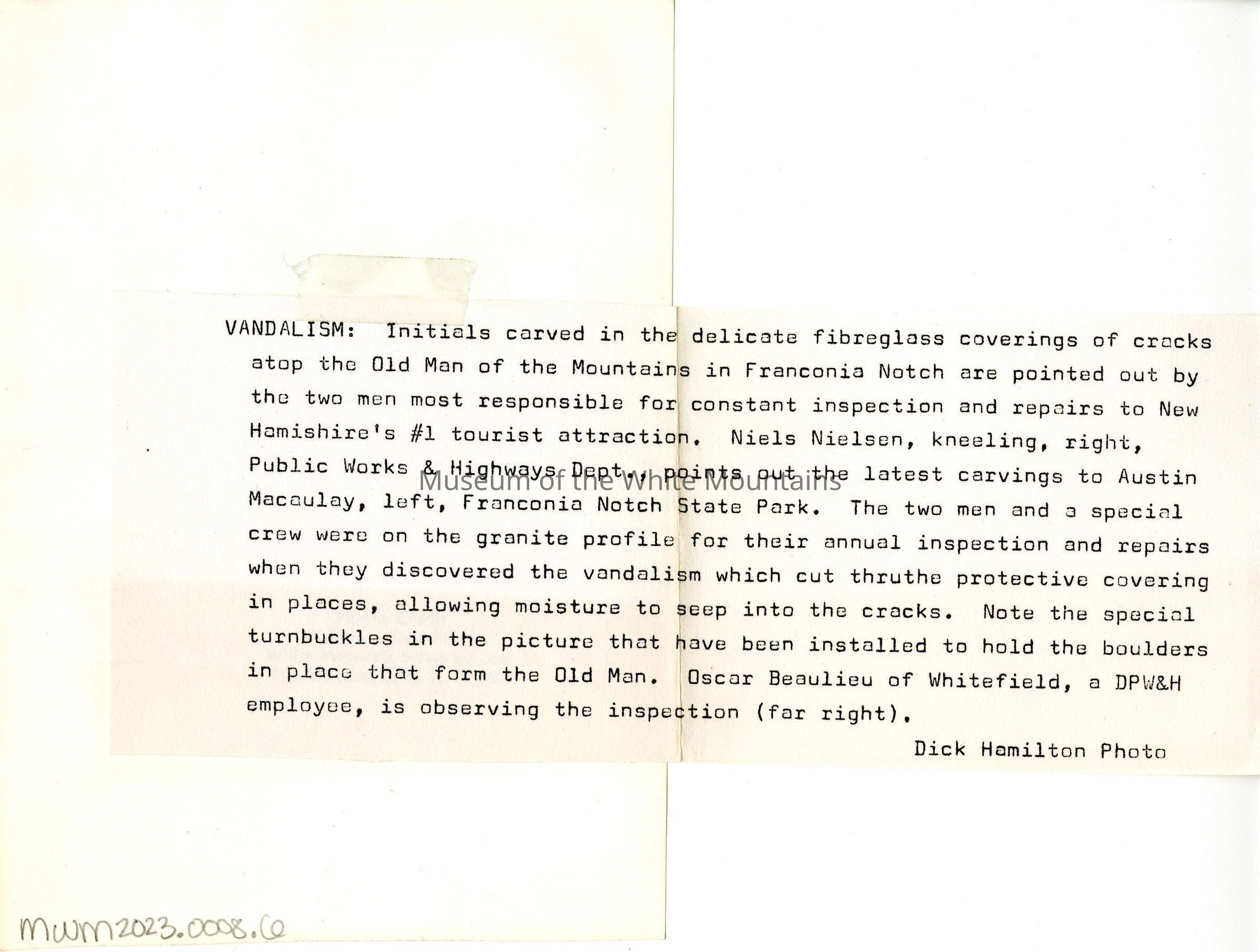 Back Note Transcribed: "VANDALISM: Initials carved in the delicate fibreglass coverings of cracks atop the Old Man of the Mountains in Franconia Notch are pointed out by the two men most responsible for constant inspection and repairs to New Hamishire's #1 tourist attraction. Niels Nielsen, kneeling, right, Public Works & Highway Dept., points out the latest carvings to Austin Macaulay, left, Franconia Notch State Park. The two men and a special crew were on the granite profile for their annual inspection and repairs when they discovered the vandalism which cut thruthe protective covering in places, allowing moisture to seep into the cracks. Note the special turnbuckles in the picture that have been installed to hold the boulders in place that form the Old Man. Oscar Beaulieu of Whitefield, a DPW&H employee, is observing the inspection (far right). Dick Hamilton Photo"Photograph Details