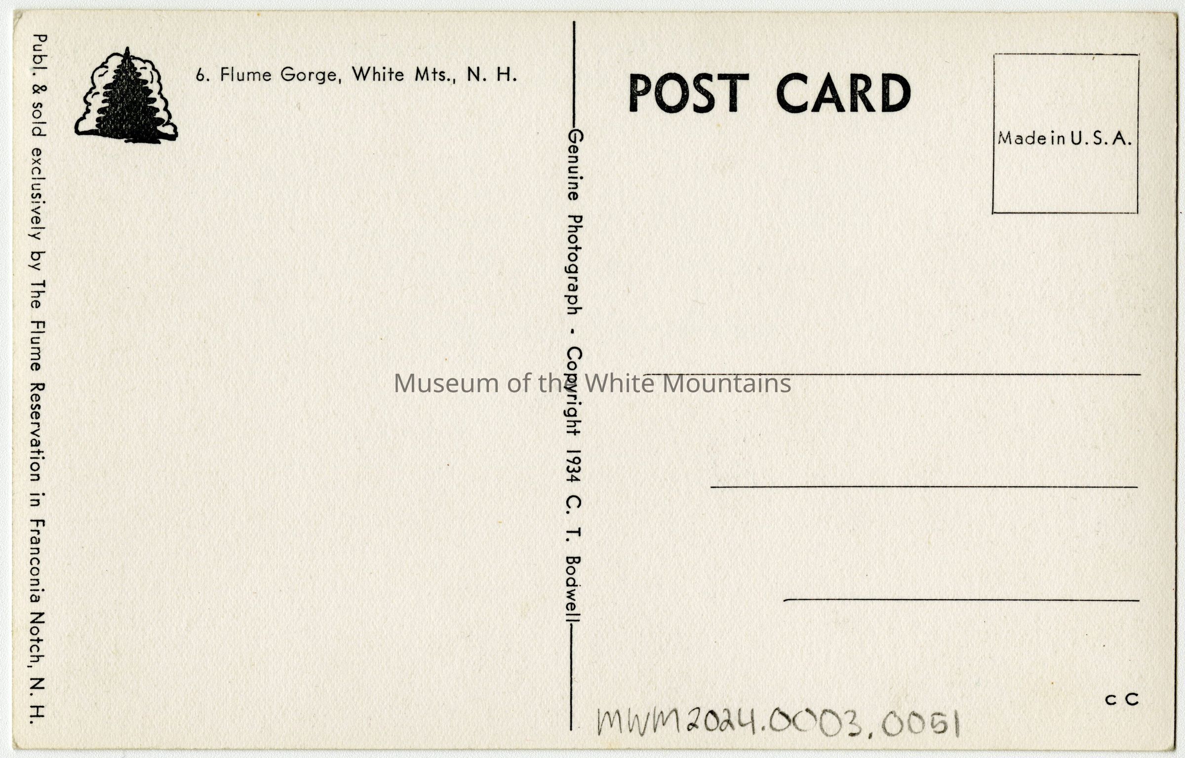 Divided postcard back without writing. Contains plain text version of cursive writing on front: '6. Flume Gorge, White Mts., N. H.'Subject