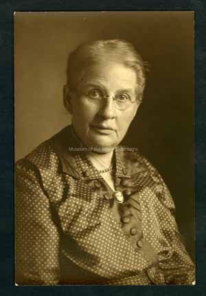 Sepia toned portrait of Mrs. Cyrus Gale. This portrait is a headshot of Mrs. Cyrus Gale. She is wearing a dark dress with white polka-dots. She is also wearing a pearl necklace and glasses.