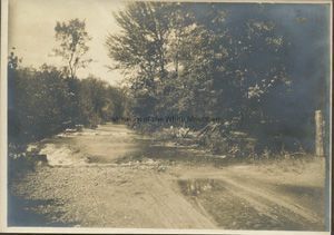Black and white view of a bend in the river at an unidentified location. In the foreground there are tire tracks leading up to the edge of the river. On the right side of frame there is a fence post. In the background there are a lot of trees and bushes along the river side.