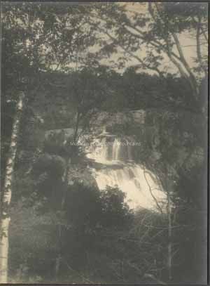 Black and white view of a waterfall at an unidentified location. In the foreground there are trees and bushes. In the back ground there is a tree line and rock formations surrounding the waterfall.