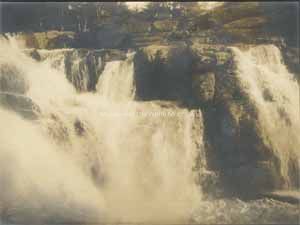 Black and white view of waterfall at unidentified location. Several rock formations and a tree line in the background. Waterfall appears in the foreground on left side of frame.