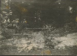 Black and white view of a wooded area. In foreground there is a small field with small light colored flowers. In background there is a heavily wooded area.