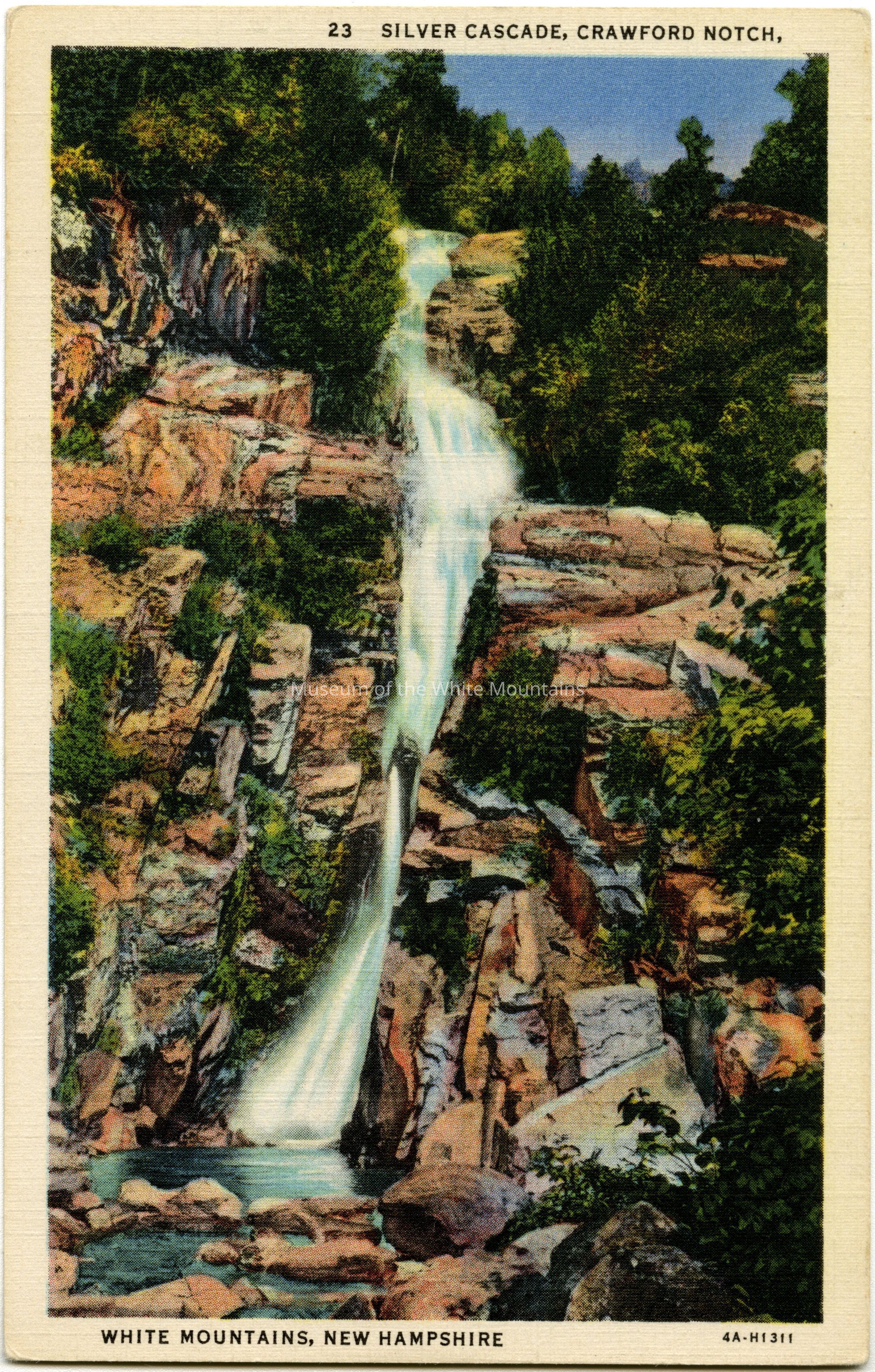 A postcard containing a portrait photograph of Silver Cascade (waterfall) in Crawford Notch, White Mountains, New Hampshire. The image is in color.