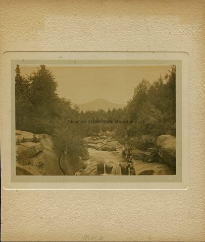 Sepia toned image of a rocky river among trees with a mountain in the background. In the foreground there is a small waterfall. The river is surrounded by trees on either side. Written in pencil at the bottom, "No. 3."