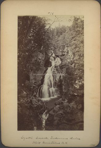 Black and white image of a waterfall among rocks and trees. The waterfall is centered within the composition. Caption in pen reads, "Crystal Cascade, Tuckermans Ravine, White Mountains N.H. 1884."Collection