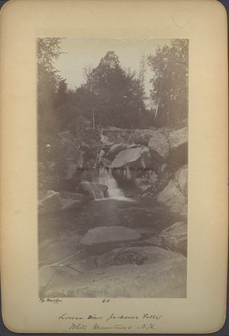 Black and white image of a waterfall among large rocks with trees in the background. The waterfall is centered within the composition. Written in pen, "Lower View Jacksons Falls White Mountains NH; The Masher 60." Possibly from an 1884 trip to the White Mountains.