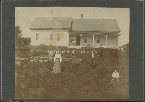 Black and white image of several people standing outside a small house. The house has gable ends, a small front porch, and clapboard siding. On the porch there is a rocking chair. In the middleground there is a small garden with a stone wall in front of it. There is a woman sitting on the stonewall. To her left is another woman standing. To the right there are three men standing in the grass. In front of them is a younger boy sitting in the grass.Collection
