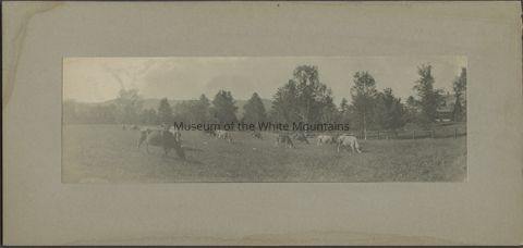 Image is a black and white panoramic print of a field with cows grazing. The field is surrounded by a wooden fence. A house is in the background. Beyond the fence there are trees. In the distance are mountains. There is a building visible in the background to the right.