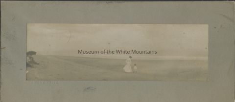 Black and white panoramic print of a woman in a white dress and a child walking on the beach. Several people, one holding a parasol sit on the sand behind them to the left. Stamped on front, "T. E. M. and G. F. White." Written in pencil, "Salisbury Beach, NH."