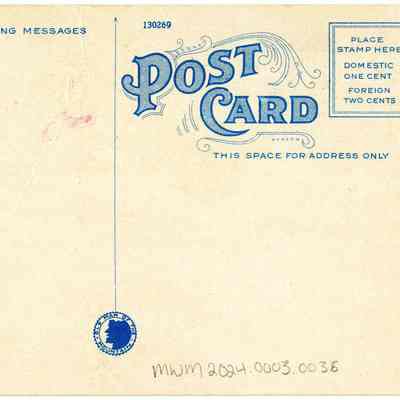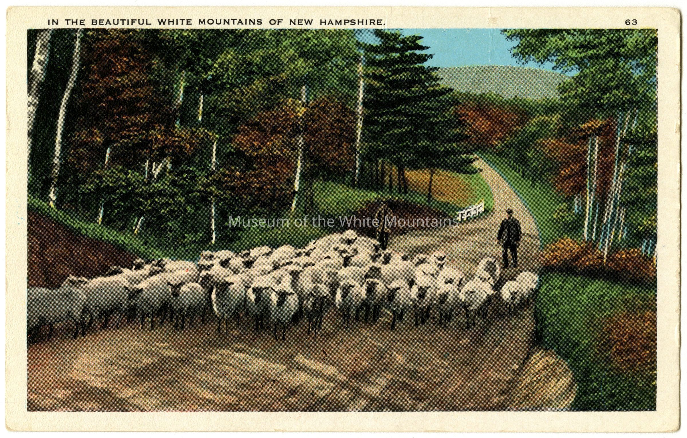 A postcard containing a landscape image of a flock of sheep being herded down a dirt road in the White Mountains of New Hampshire. The image is in color.