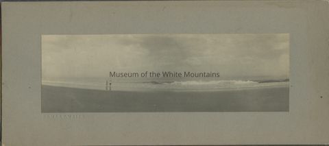 Black and white panoramic print of two people walking on the beach. A wave is crashing to the right half of the image. The two people are walking in the far distance along the water to the left. Stamped on front, "T. E. M. White and G. F. White." Written in pencil, "Salisbury Beach, NH."