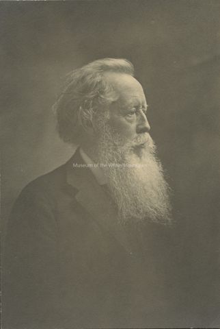 Black and white portrait of an elderly man with a long white beard and long white hair. He wears a jacket and a white shirt. He is looking to the right. Man is noted North Conway photographer, T. E. M. White. Written in pencil, "Property of Gabriella F. White."