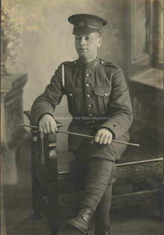 Black and white portrait of a young man in a wool uniform holding a baton, sitting on a bench in a photography studio. His uniform is Canadian; there is a maple leaf on his hat. He has a ring on his right pinky. He is looking to the left.