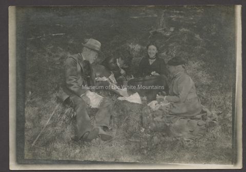 Black and white image of four people sitting in a grassy area having a picnic. To the left is an older man in a suit with a white beard. Beside him is a woman reclining, reaching into the picnic basket; a seated woman, smiling and looking at the camera; and another seated woman, looking to the left. Each person has a white napkin on their laps. The older man is possibly Benjamin Champney.Collection