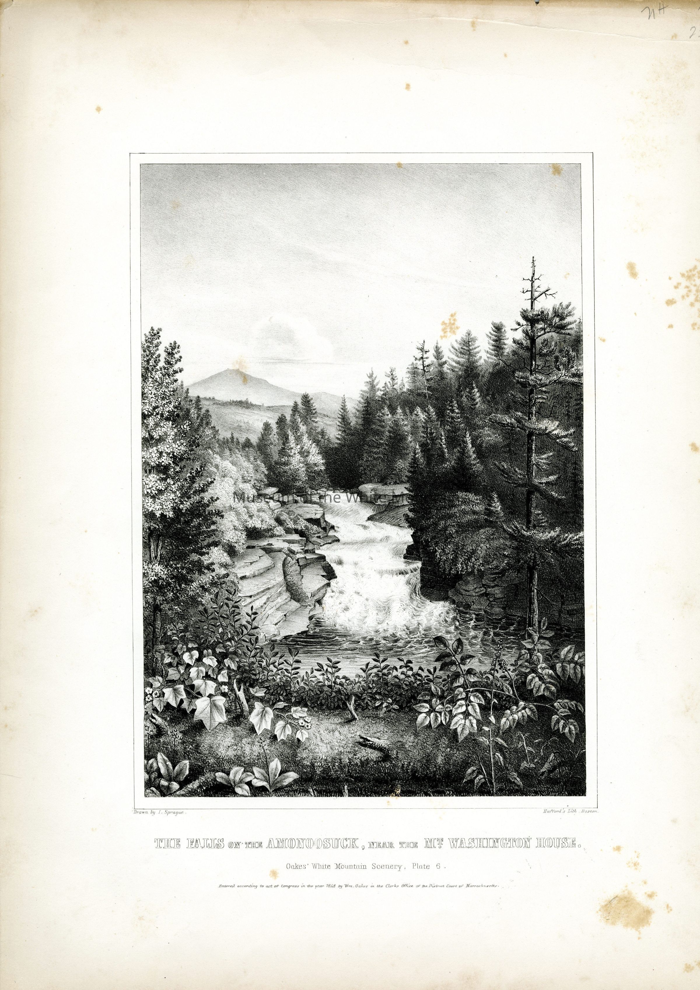 THE FALLS ON THE AMONOOSUCK, NEAR THE MT WASHINGTON HOUSE. / Oakes' White Mountain Scenery, Plate 6. / Entered according to act of Congress in the year 1848 by Wm. Oakes in the Clerks Office of the District Court of Massachusetts.Language