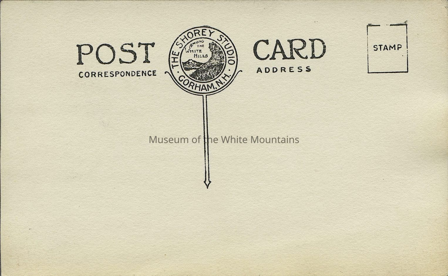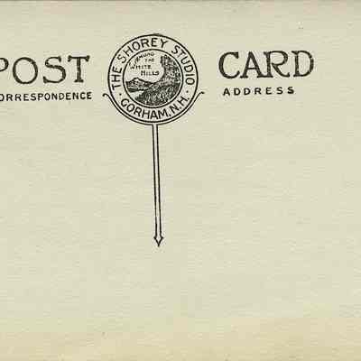 Back Description: Features Shorey Studio emblem of the "Old Man on the Mountain," and reads,"The Shorey Studio, Gorham, N.H.; Among the White Hills." Printed on back, "Post Card, Correspondence, Address, stamp."Collection