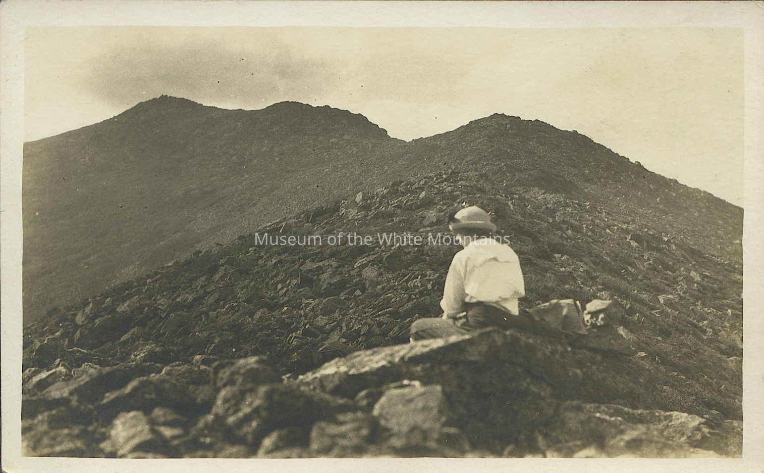 Black and white image of woman sitting among a rocky mountaintop with mountains in the distance. Woman wears a hat, blouse and pants.