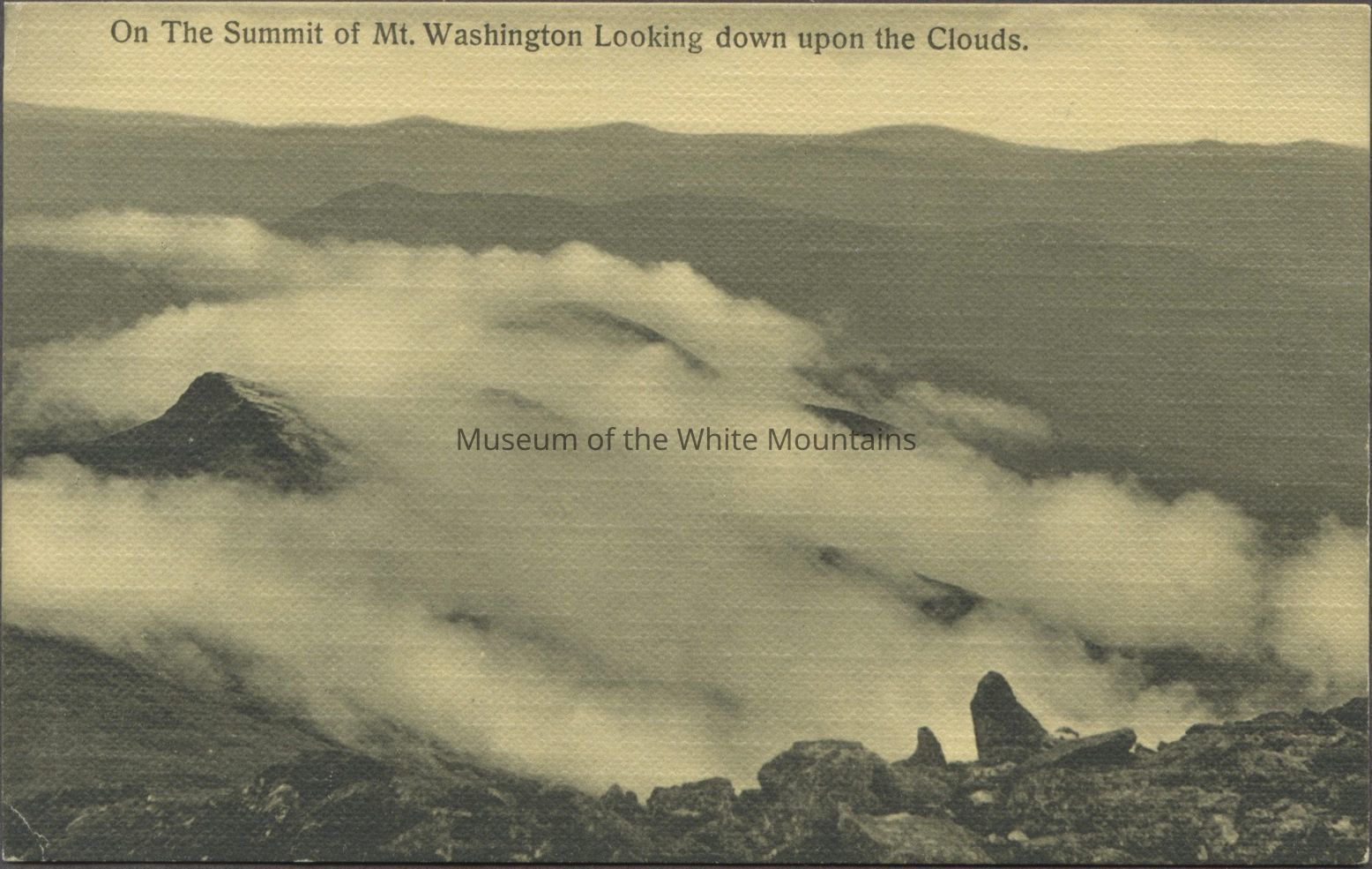 Black and white image of clouds within mountaintops. Printed on front, “On the summit of Mt. Washington looking down upon the clouds.”