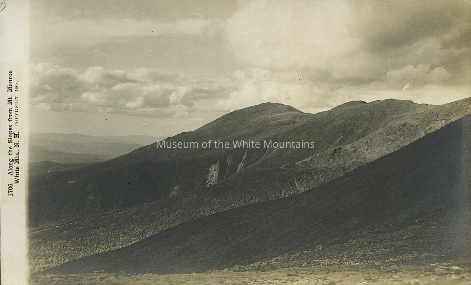 Black and white image of the slopes of mountains with more mountains in the distance. The sky above is cloudy. Printed on front, “1706. Along the slopes from Mt. Monroe White Mts., N.H. Copyright 1908.”