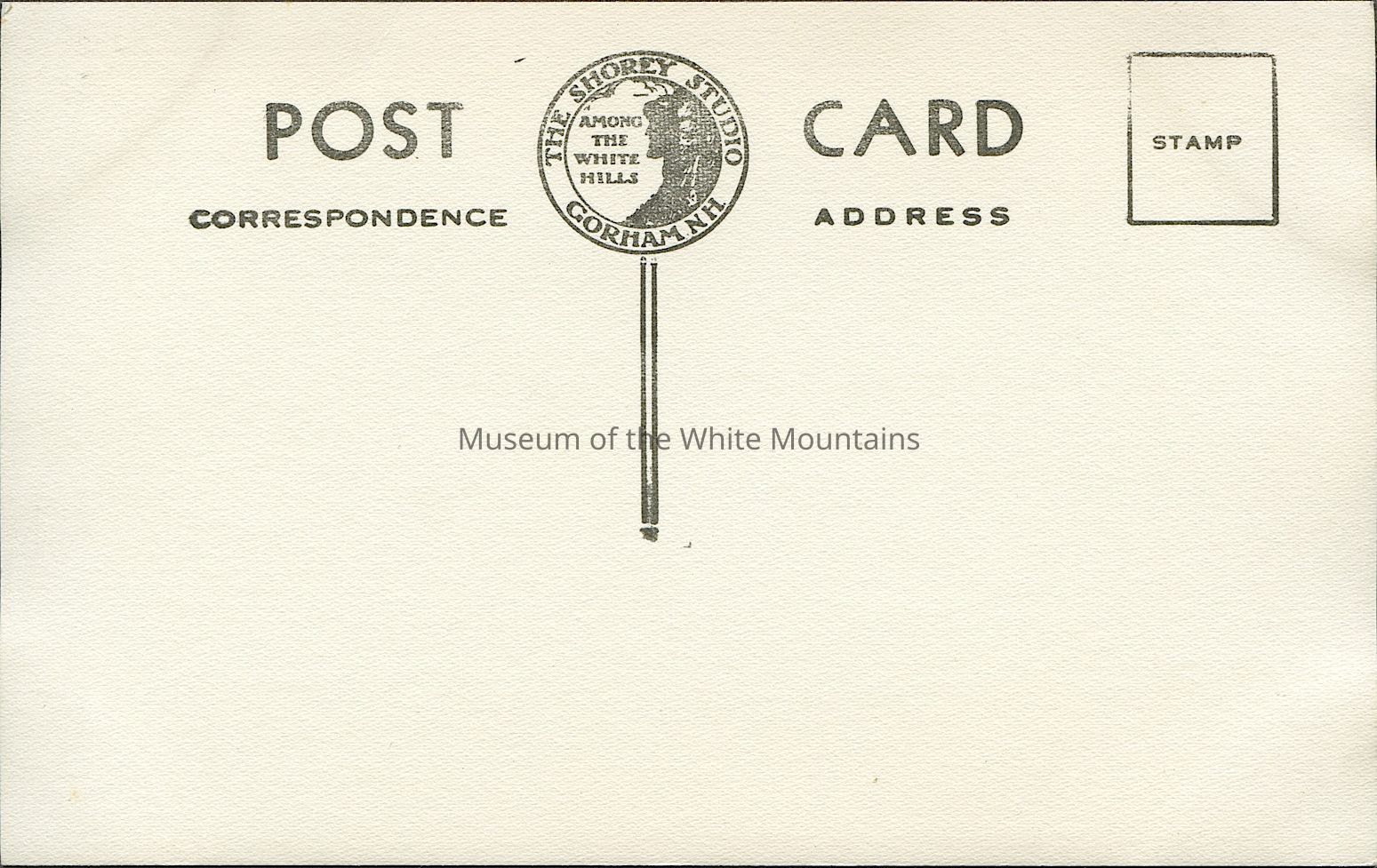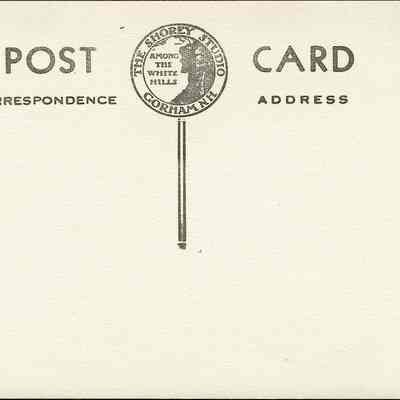 Back Description: Printed on back, “Post Card, correspondence, address, stamp.” Features logo with the Old Man on the Mountain which reads, “The Shorey Studio, Gorham NH, Among the White Hills.”Collection