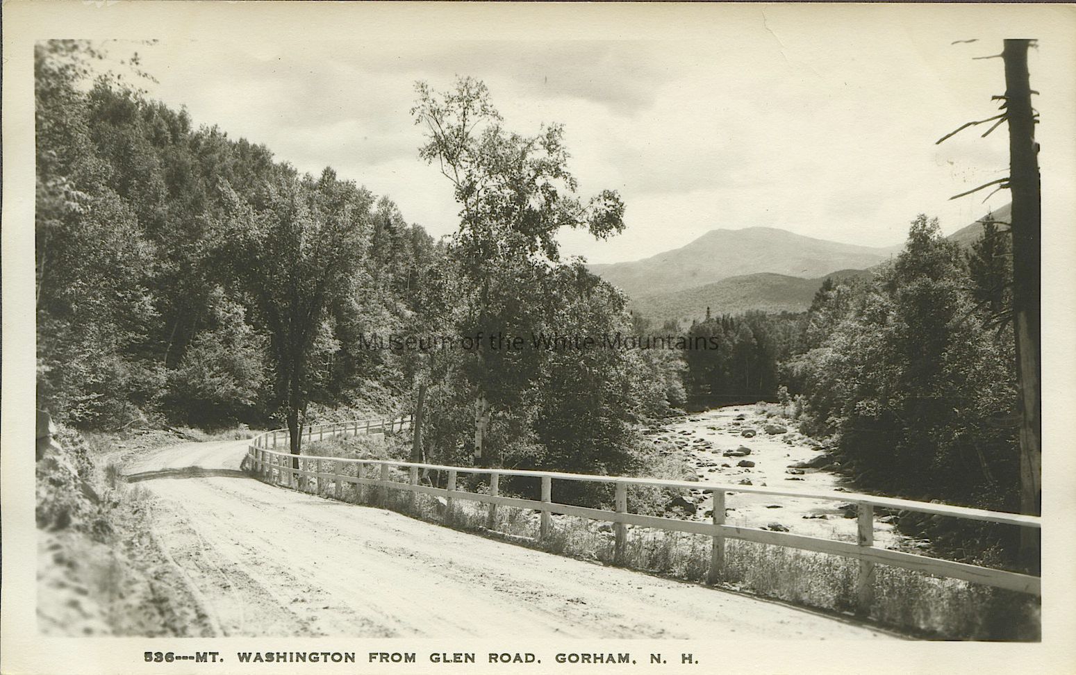 Black and white image of a dirt road by between a wooded mountainside and a river. A wooden fence runs alongside the road by the river. In the distance are more mountains. Printed on front, “536---Mt. Washington from Glen Road, Gorham, N.H.”