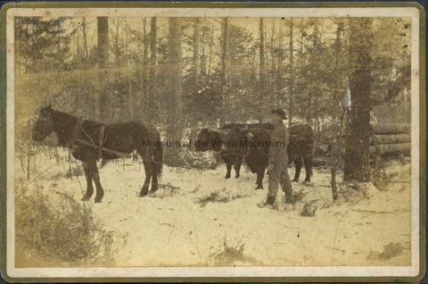 Animals, People associated with manual labor, Winter, Snow, Horse teams, Trees, Oxen, Forests, Logs, People associated with agriculture, Ox teams, Horses, Animal teams, Clearing of landSearch Terms