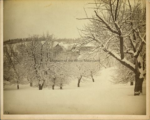Sepia toned view of a snowy area in the White Mountains with bare trees covered in snow. In the distance are the snowy rooftops of buildings.