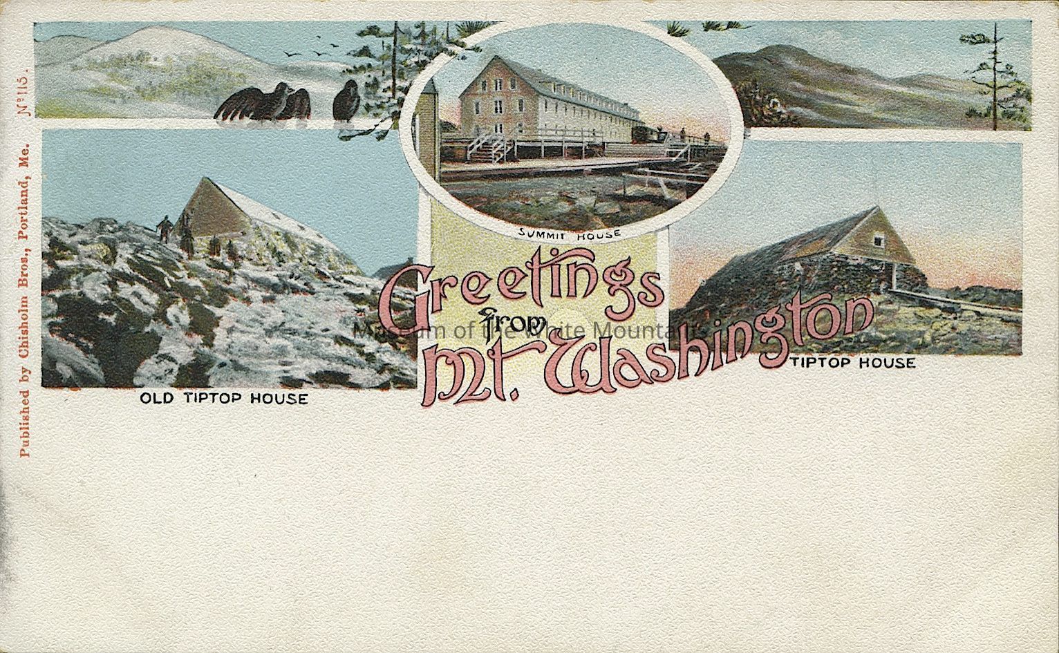 Colored collage of images featuring three similar houses with gable ends facing front, and two mountain landscapes. Printed on front, “Greetings from Mt. Washington, Old Tip Top House, Tip Top House, Summit House; Published by Chisholm Bros., Portland, ME