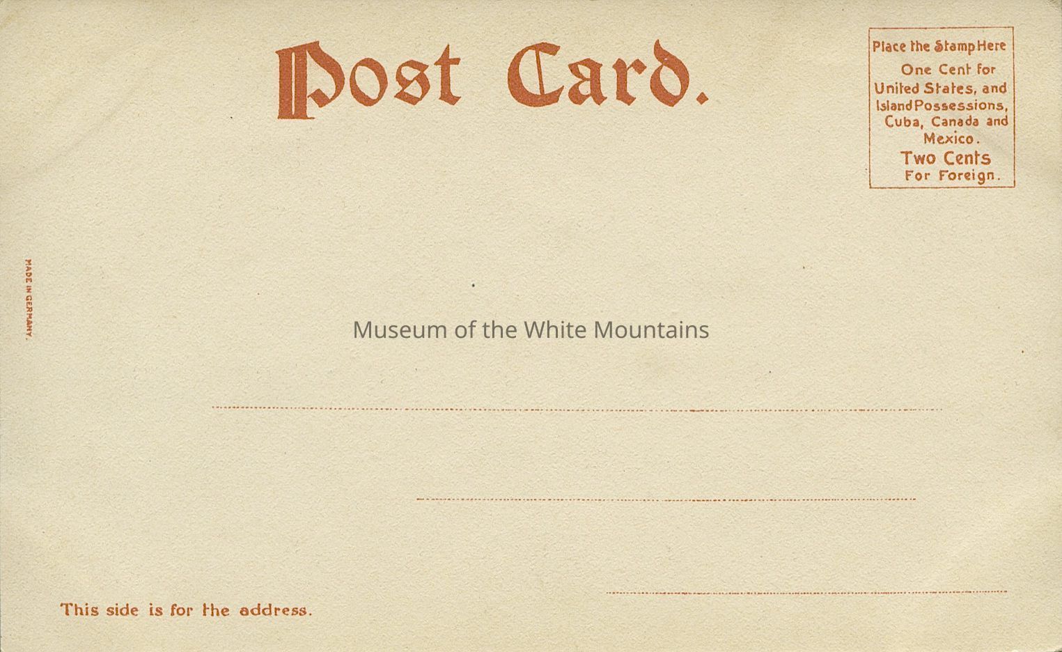 Back Description: Printed on back, “Post card, This side is for the address, Made in Germany, Place the stamp here, one cent fo United States and island possessions, Cuba, Canada, and Mexico, two cents for foreign.”Collection