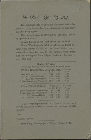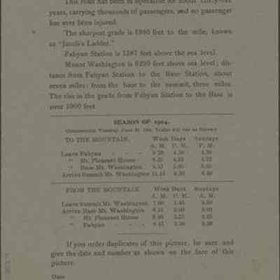Washington, Mount (Coos county, New Hampshire : mountain), Mount Washington Cog Railway, Jacob's Ladder (Coos county, New Hampshire : structure), Fabyan Station (Coos county, New Hampshire : inhabited place), Mount Washington Base Station (Coos county, New Hampshire : inhabited place), Fabyan House (Coos county, New Hampshire : inhabited place), Mount Pleasant House (Carroll county, New Hampshire : inhabited place), Bretton Woods (Coos county, New Hampshire : inhabited place), Railroad Automobiles, Railroad lounge Automobiles, Railroad passenger Automobiles