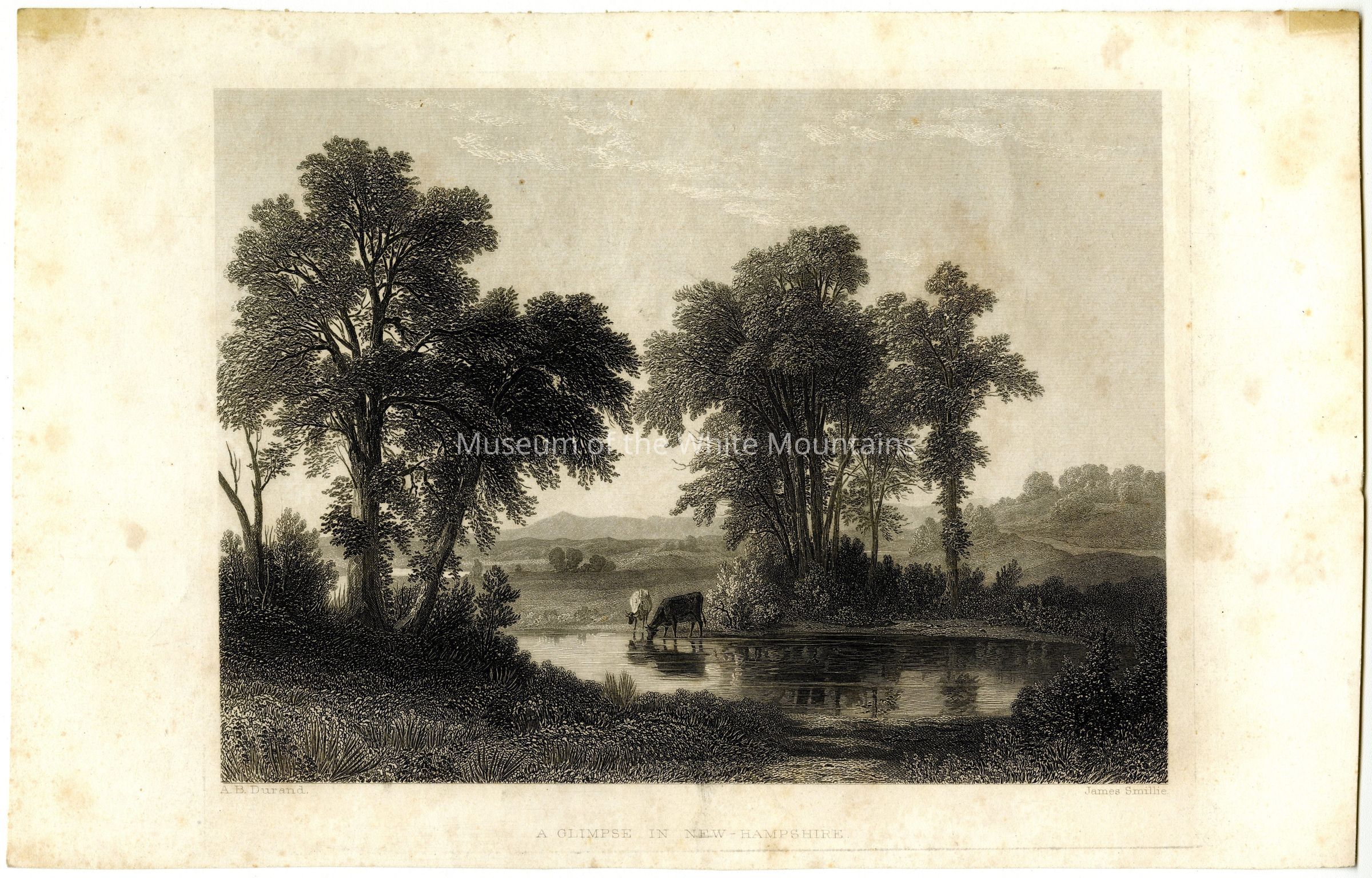 A landscape engraving of cows drinking from a stream among bushes and trees with mountains in the distance.