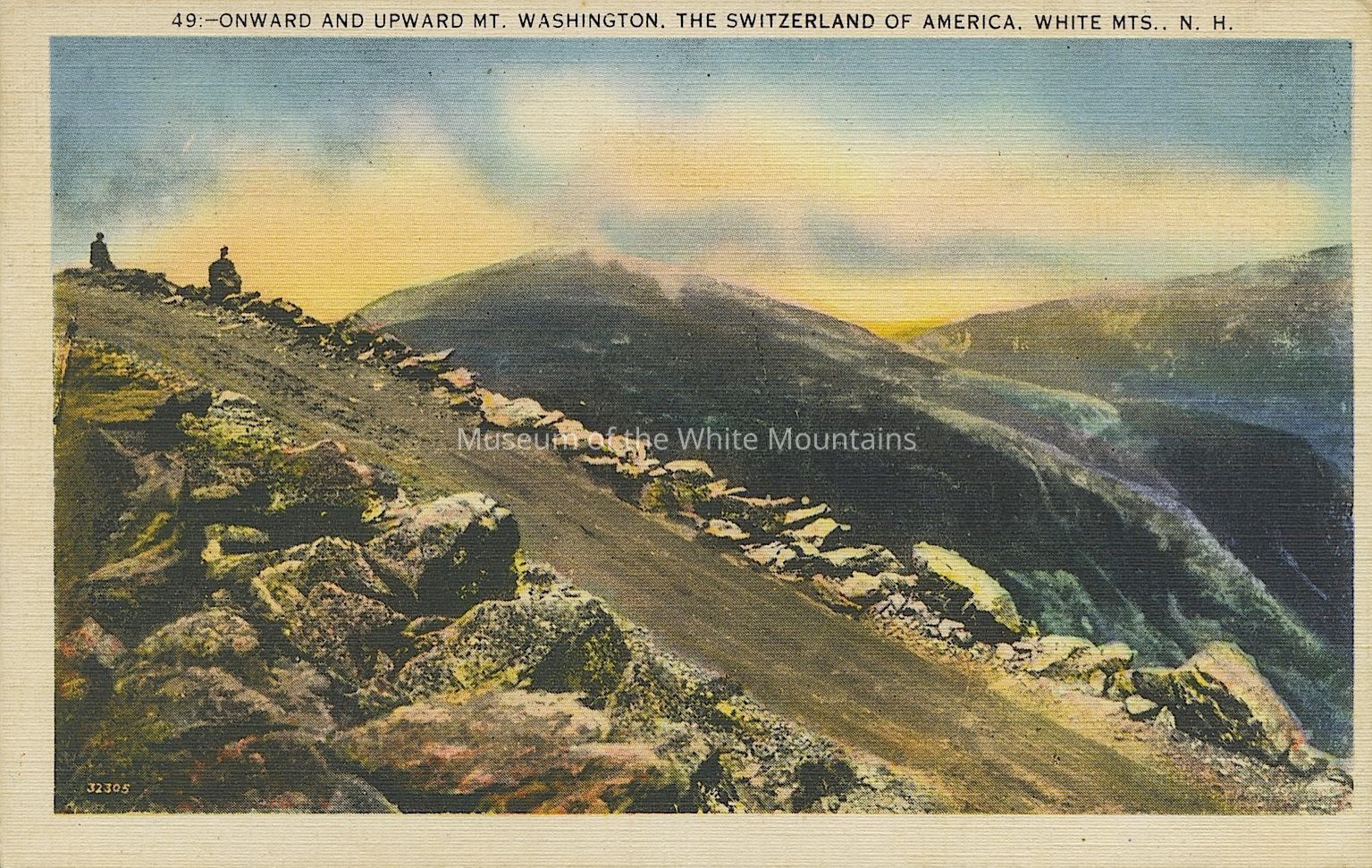 Colored image of a steep dirt road among a mountainous landscape. People are at the crest of the road. The landscape is rocky. Printed on front, “49- Onward and upward Mt. Washington, The Switzerland of America, White Mts. NH.”