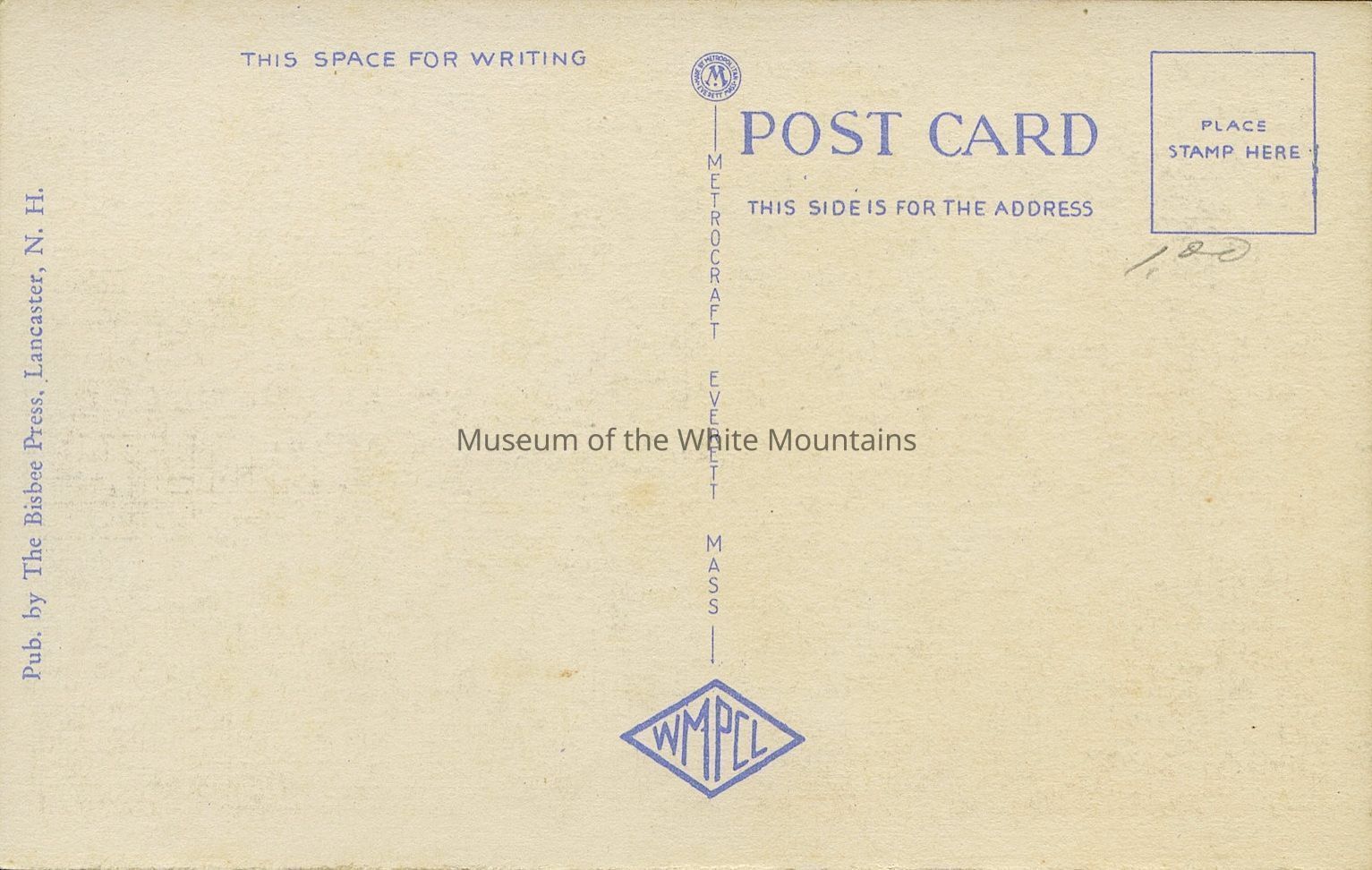 Back Description: Printed on back, “Post card, this side for the address, place stamp here, this space for writing, pub by The Bisbee Press, Lancaster NH, Metrocraft, Everett Mass, WMPCL.” Written, “$1.00.”Collection