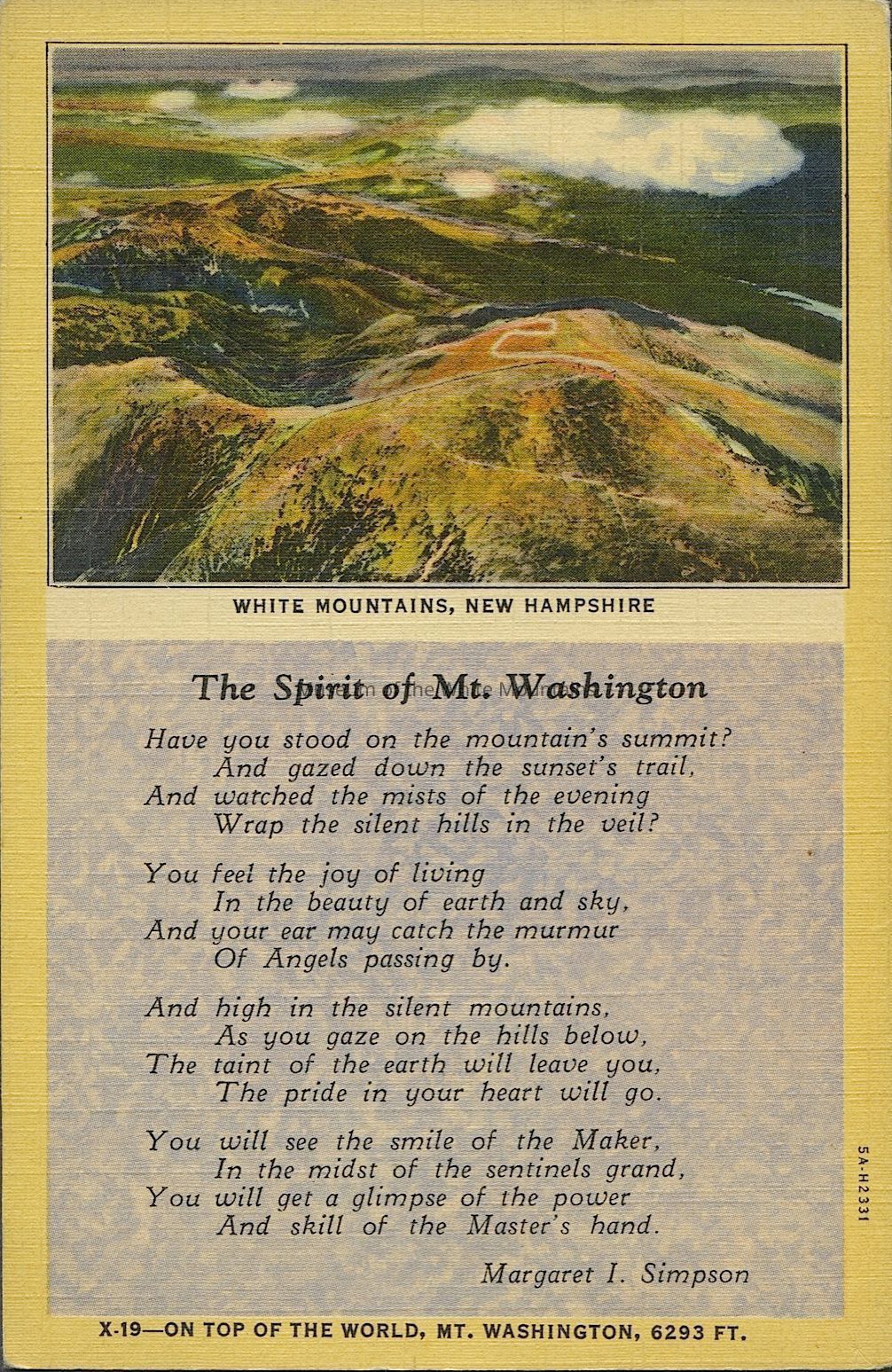 Colored image of a mountainous landscape among the clouds. Features a poem written by Margaret I. Simpson. Printed on front, “White Mountains, New Hampshire, X-19-On Top of the World, Mt Washington, 6293 ft. 5-A-H2331.”