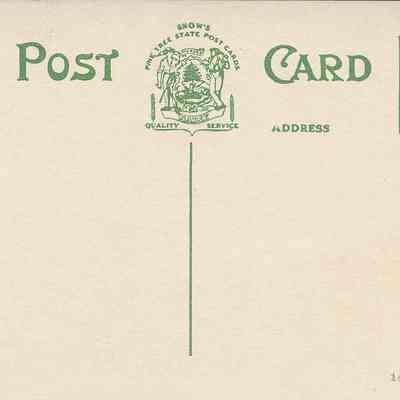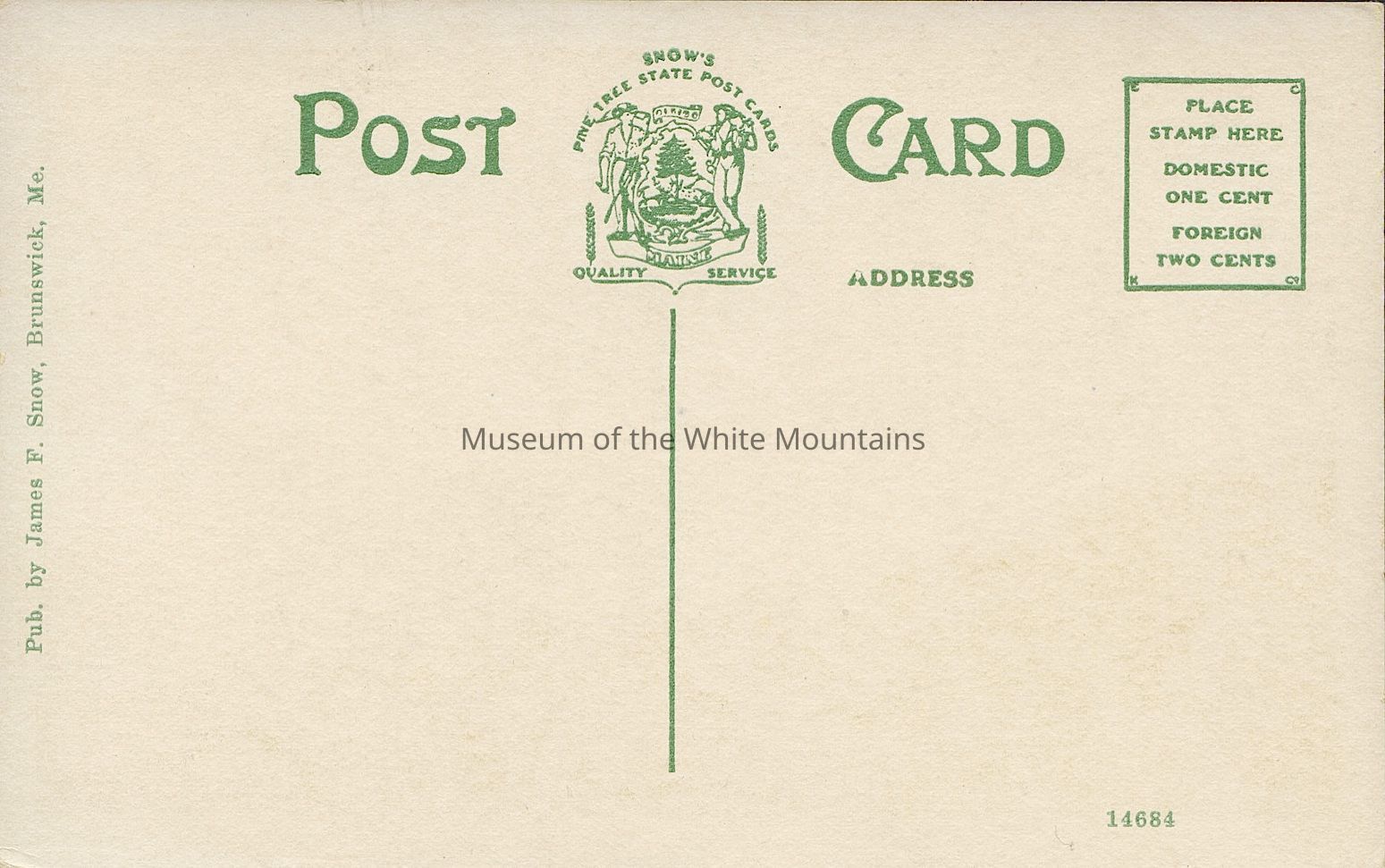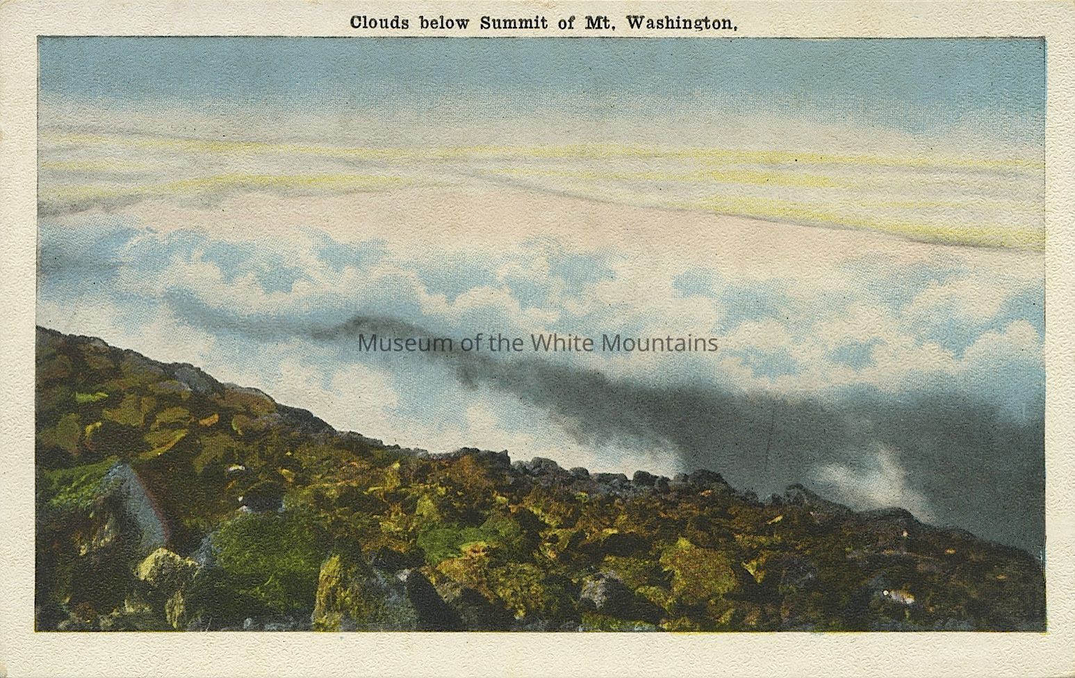 Colored image of a rocky and mountainous landscape within the clouds. Printed on front, “Clouds below Summit of Mt. Washington.”