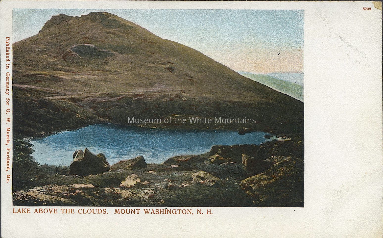 Colored image of a small body of water set within a mountainous landscape. It is surrounded by rocks. Printed on front, “Lake above the Clouds, Mount Washington, NH.”