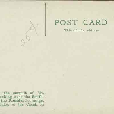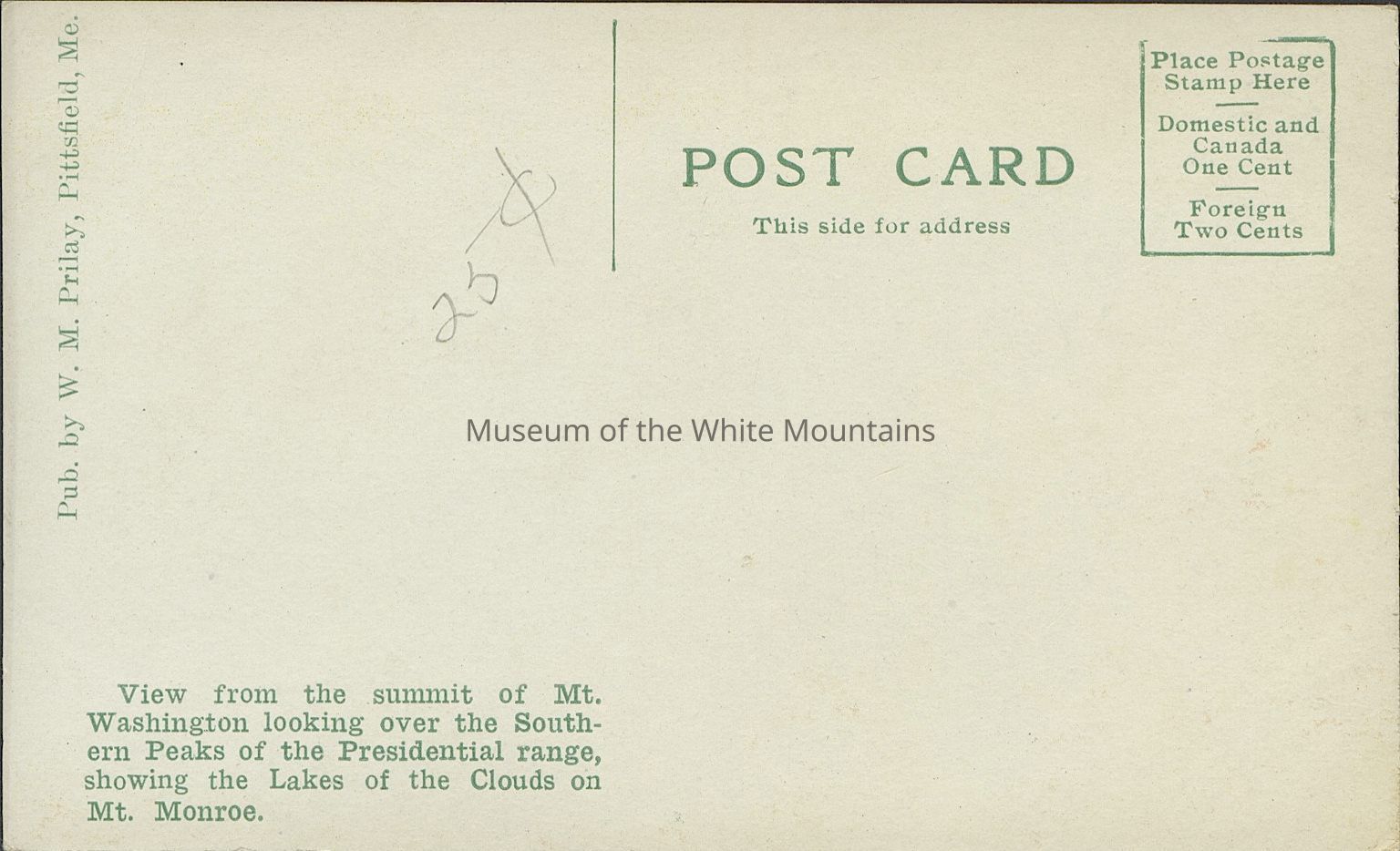 Back Description: Typical postcard back. Ptinted, “View from the summit of Mt. Washington looking over the Southern Peaks of the Presidential range, showing the Lakes of the Clouds on Mt. Monroe.”Collection