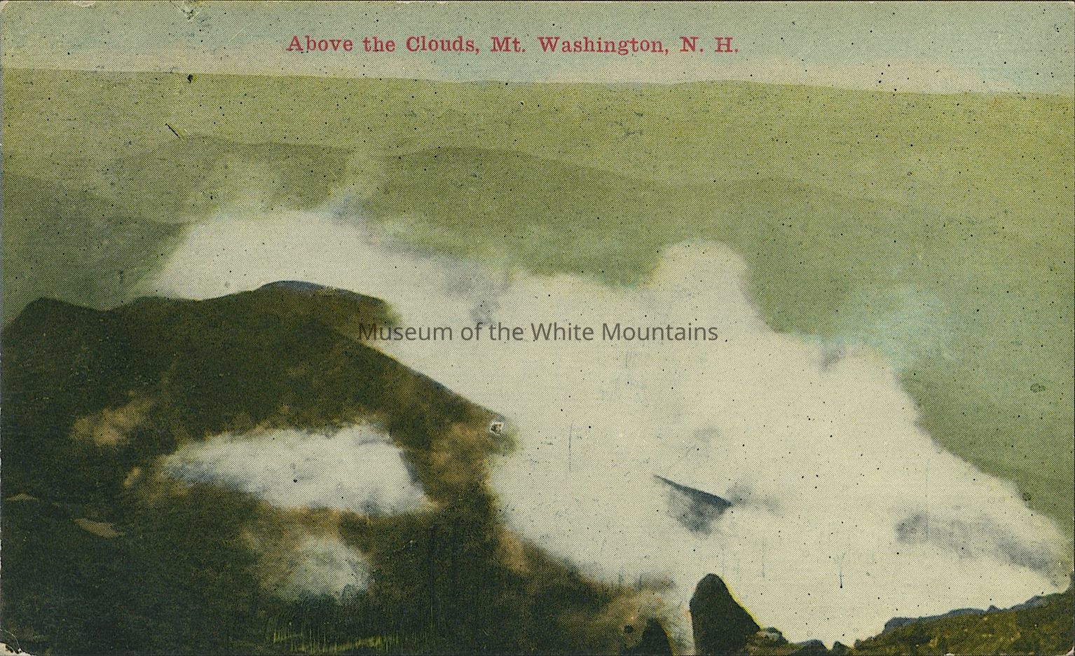 Colored image of a mountainous landscape among the clouds. Printed on front, “Above the clouds, Mt. Washington, NH.”