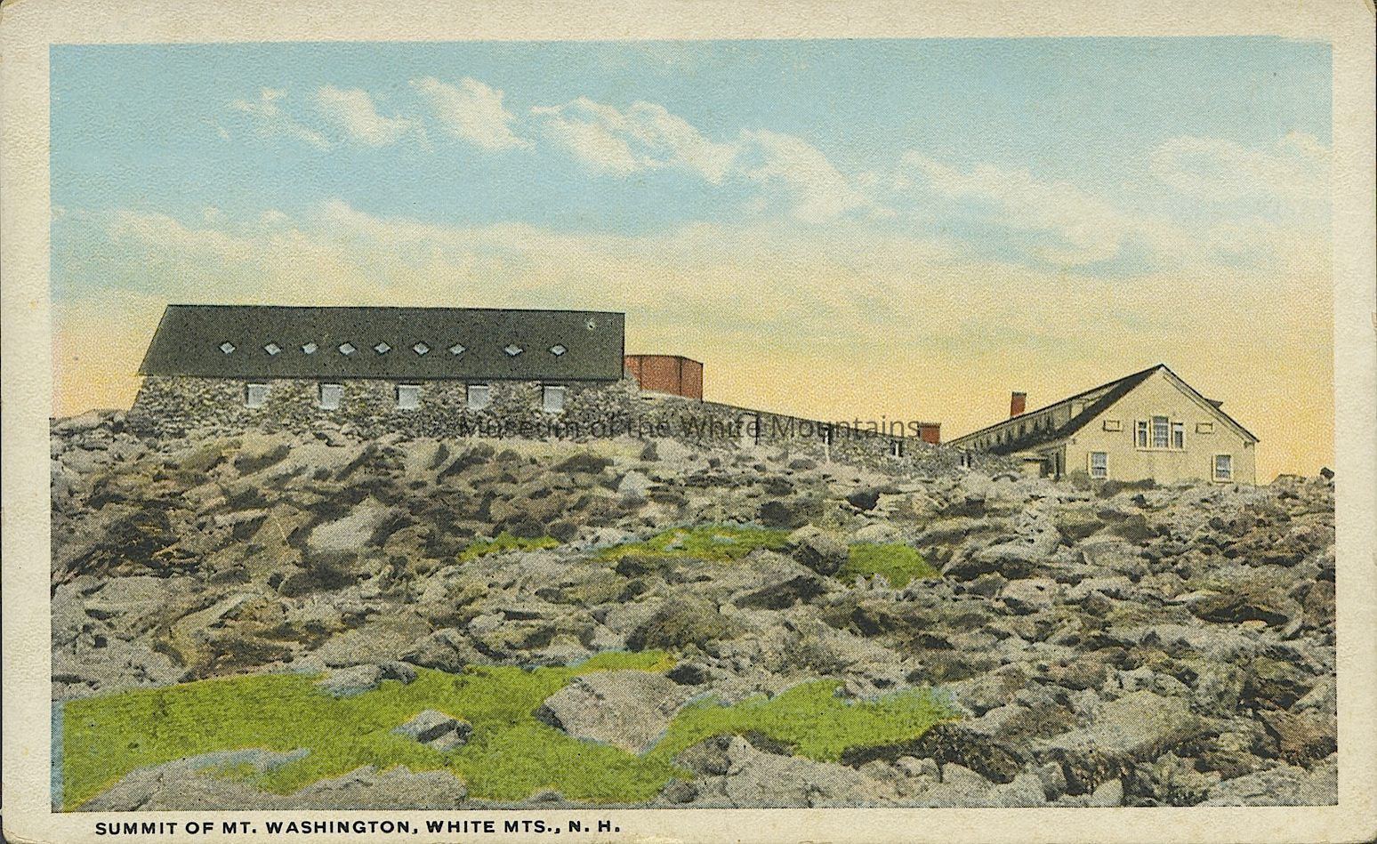Colored image of a building with its gable end facing front, and a large, long dormer on one side of the roof. Another long building with its side facing front is next to the first building. The landscape is rocky. Caption reads, “Summit of Mt. Washington, White Mts., N.H."