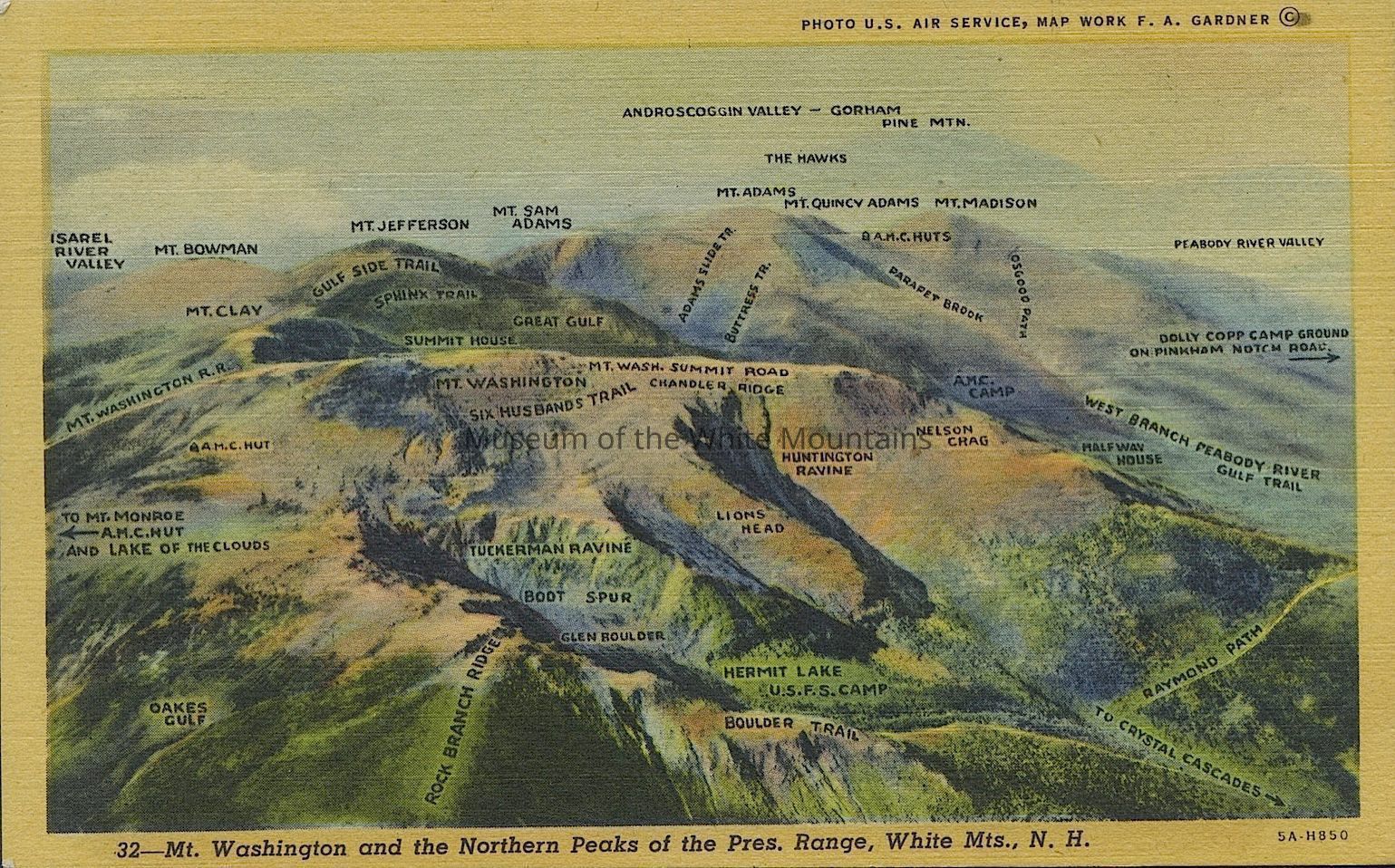 Washington, Mount (Coos county, New Hampshire : mountain), Presidential Range (Coos county, New Hampshire : ridge), Lakes of the Clouds (Coos county, New Hampshire : lake), Bowman, Mount (Coos county, New Hampshire : peak), Clay, Mount (Coos county, New Hampshire : peak), Jefferson, Mount (Coos county, New Hampshire : peak), Sam Adams, Mount (Coos county, New Hampshire : peak), Mount Washington Cog Railway, Monroe, Mount (Coos county, New Hampshire : peak), Oakes Gulf (Coos county, New Hampshire : valley), Summit House (Coos county, New Hampshire : inhabited place), Great Gulf (Coos county, New Hampshire : valley), Chandler Ridge (Coos county, New Hampshire : ridge), Tuckerman Ravine (Coos county, New Hampshire : valley), Quincy Adams, Mount (Coos county, New Hampshire : peak), Hermit Lake (Coos county, New Hampshire : lake), Trails