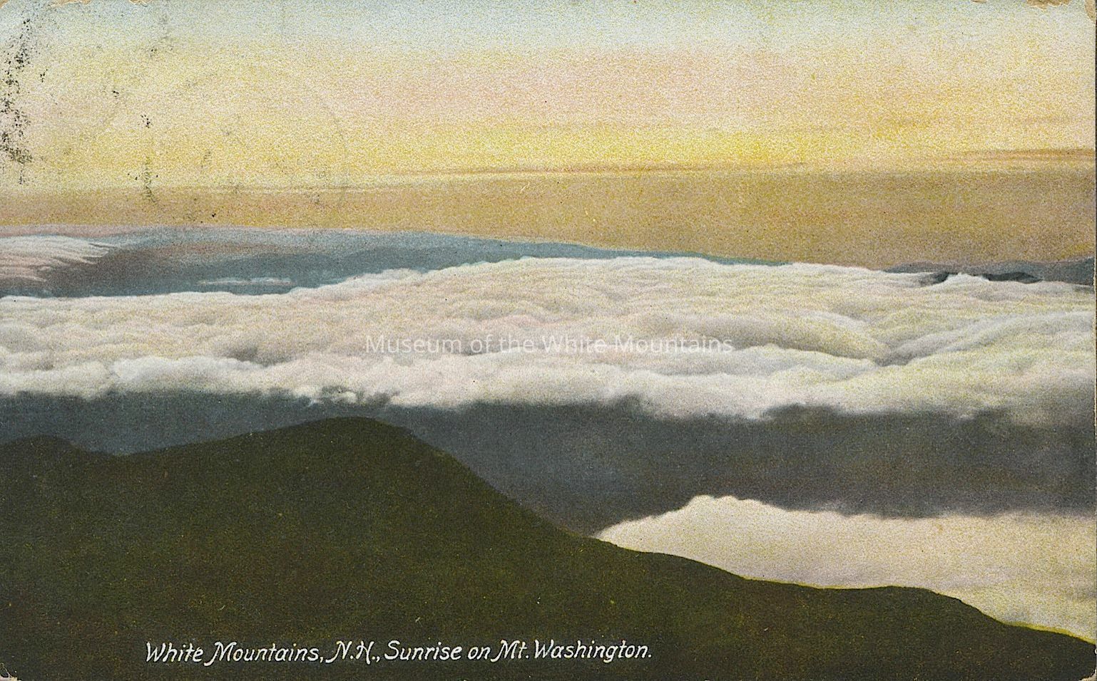 Colored image of clouds with peaks of mountains poking through. Printed on front, “White Mountains, NH Sunrise on Mt. Washington.”