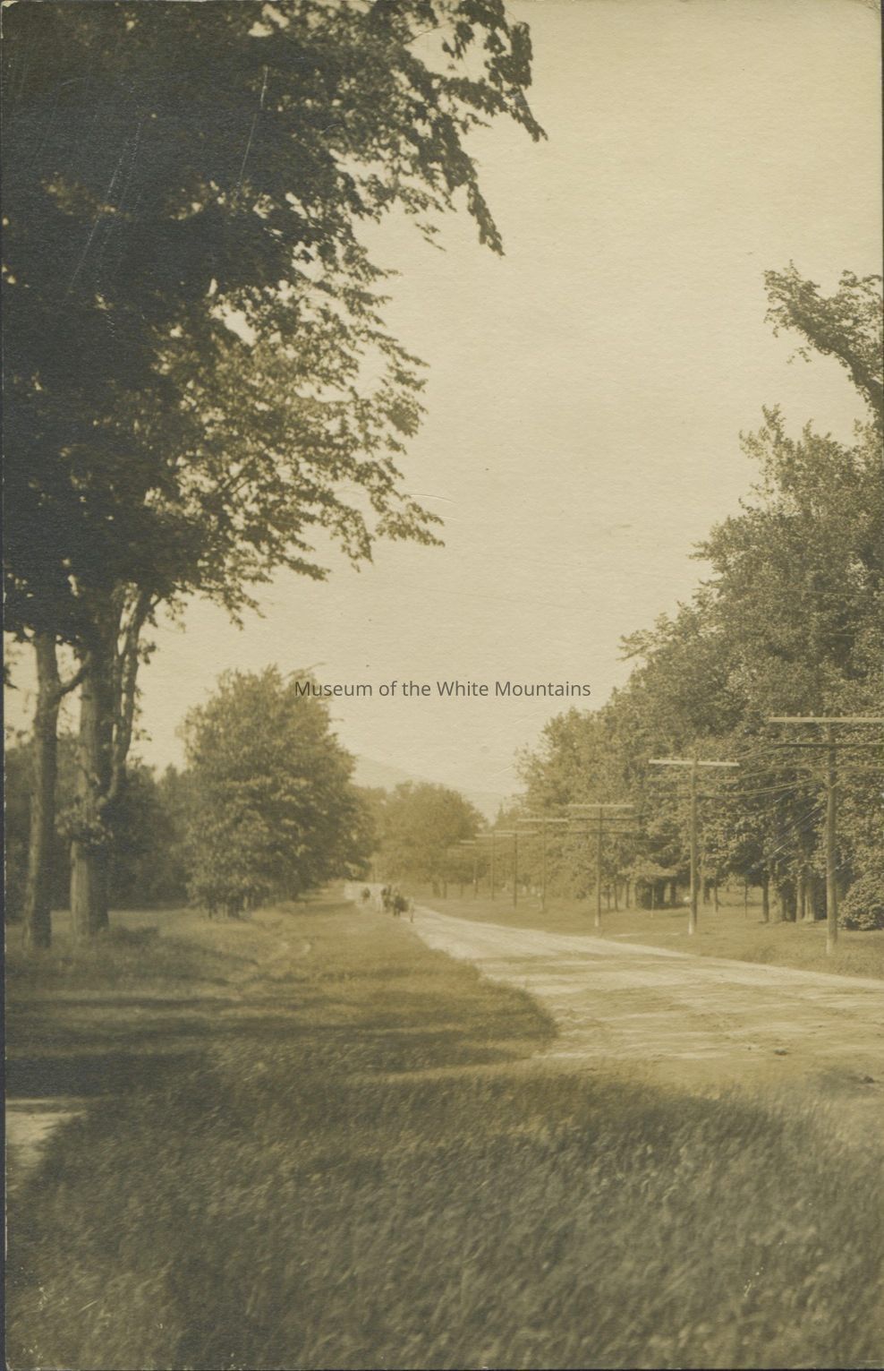 Sepia toned image of a dirt road in a grassy area with few trees and power lines. People with horses and a carriage appear to be on the road.