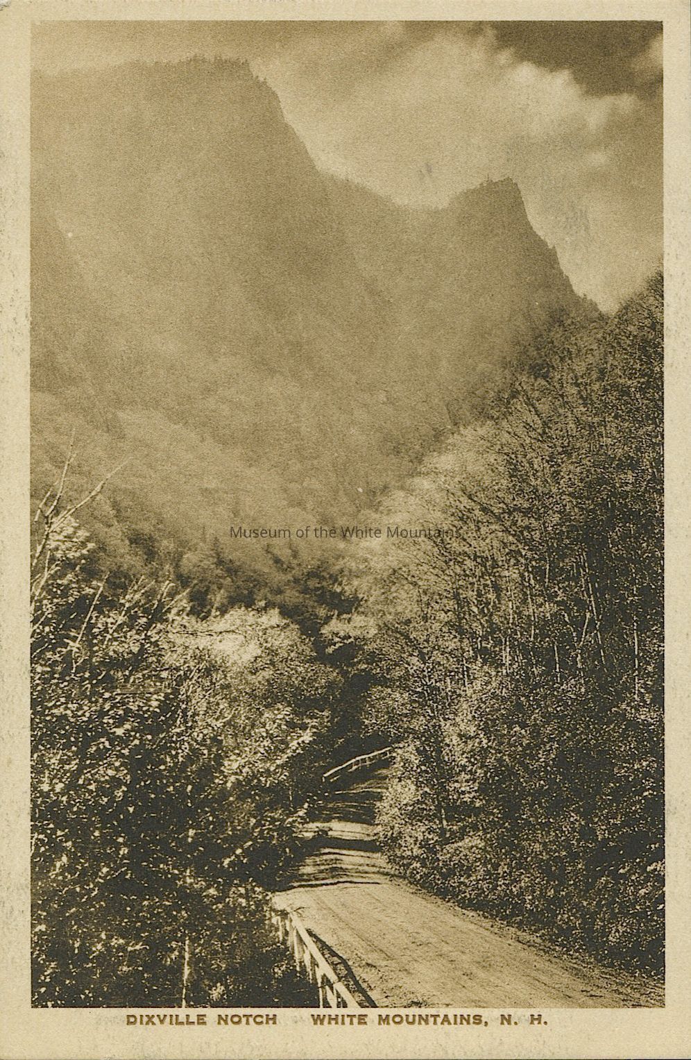 Sepia toned image of a dirt road with a fence running along one side, surrounded by trees. In the background are mountains. Caption reads, “Dixville Notch, White Mountains, N.H.”