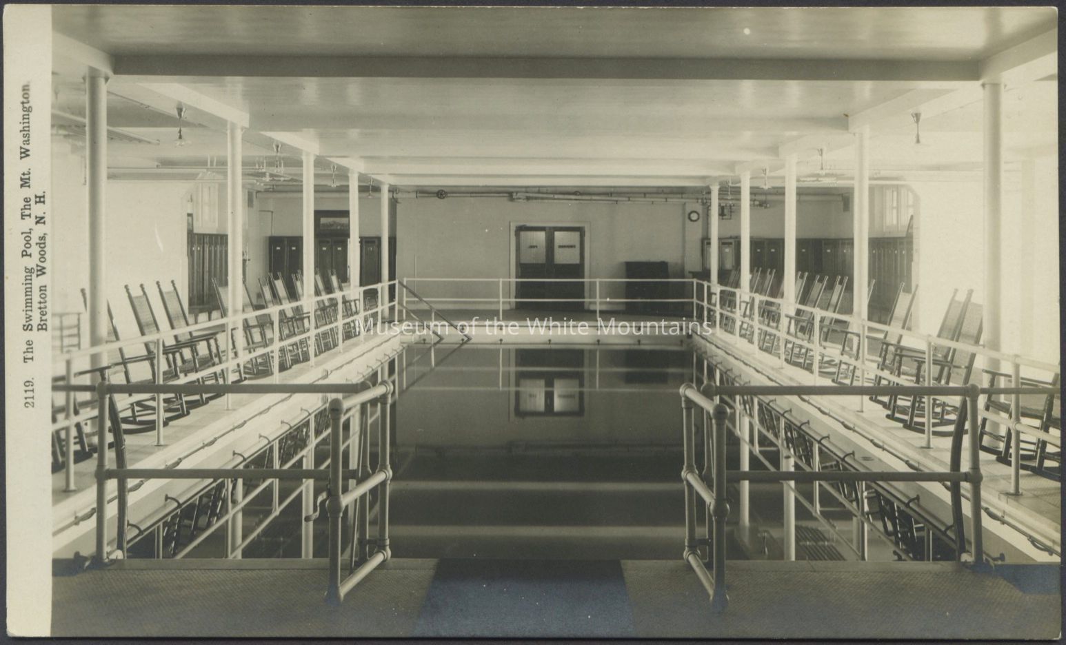 Black and white image of an interior of a room where a swimming pool is the main feature. Rocking chairs and a guard rail line the pool. The ceiling is very low. Caption reads, “The swimming pool, The Mt. Washington, Bretton Woods, N.H.”