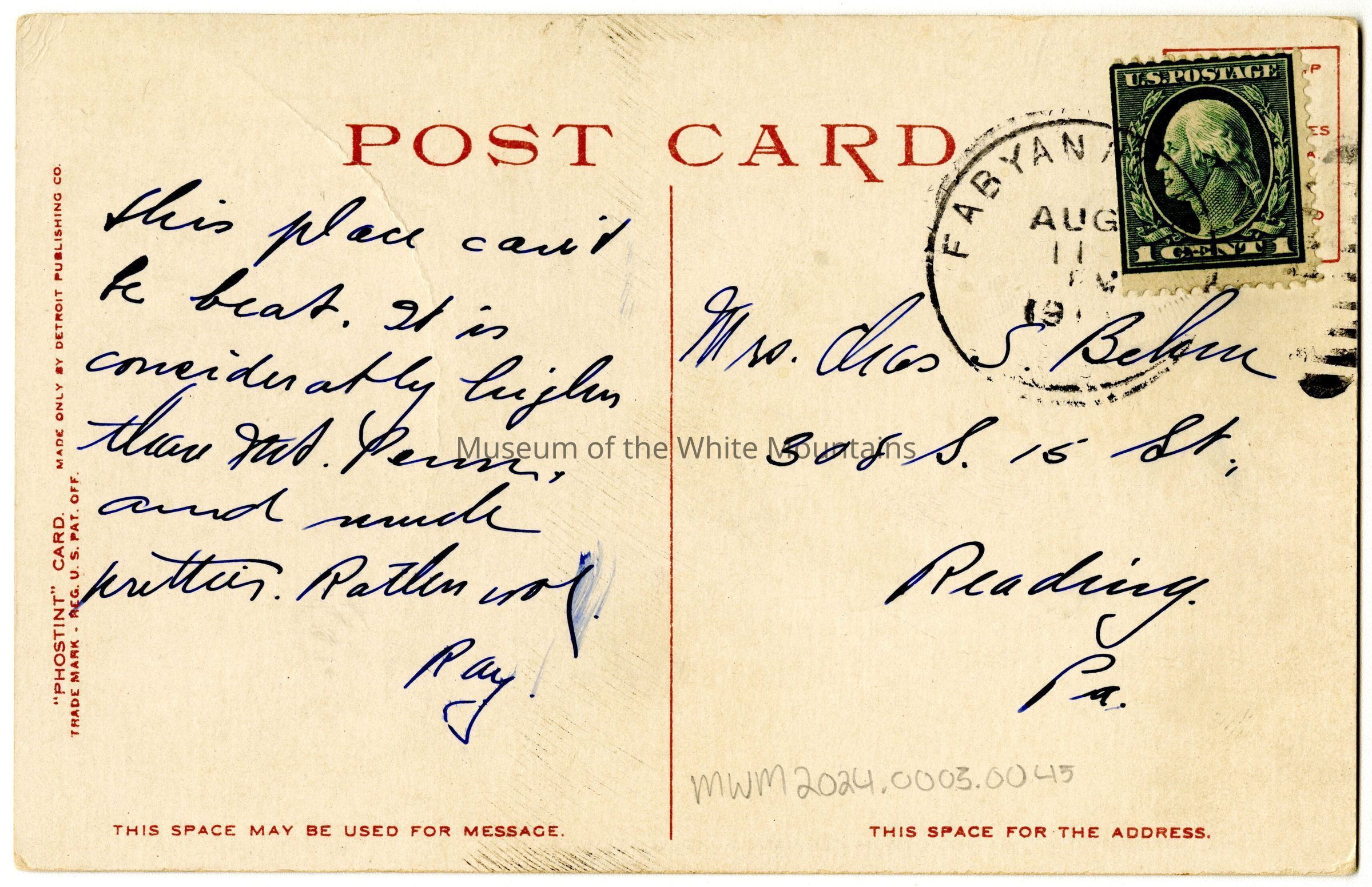 Divided "PHOSTINT" postcard back. Postmarked from the Fabyan Hotel, on August 11, 191[?], sometime after noon.