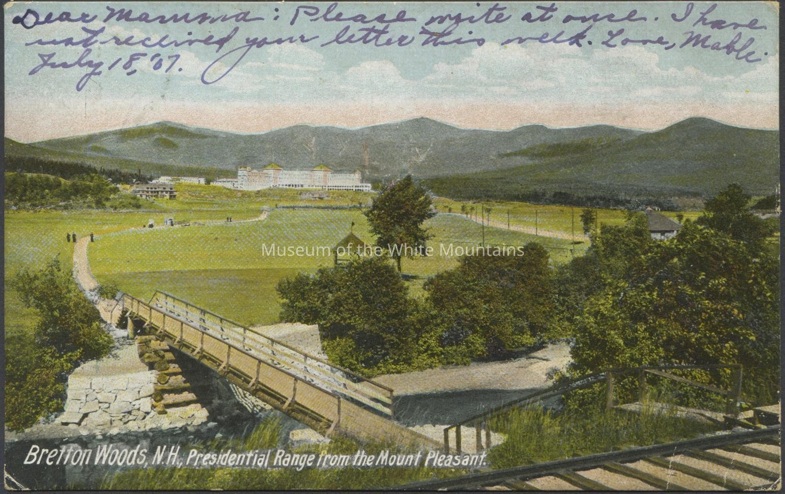 Colored image of a large hotel and grounds. The foreground includes a large walkway over a body of water. The background features a range of mountains. Caption reads, “Bretton Woods, N.H. Presidential Range from the Mount Pleasant.” Handwritten note