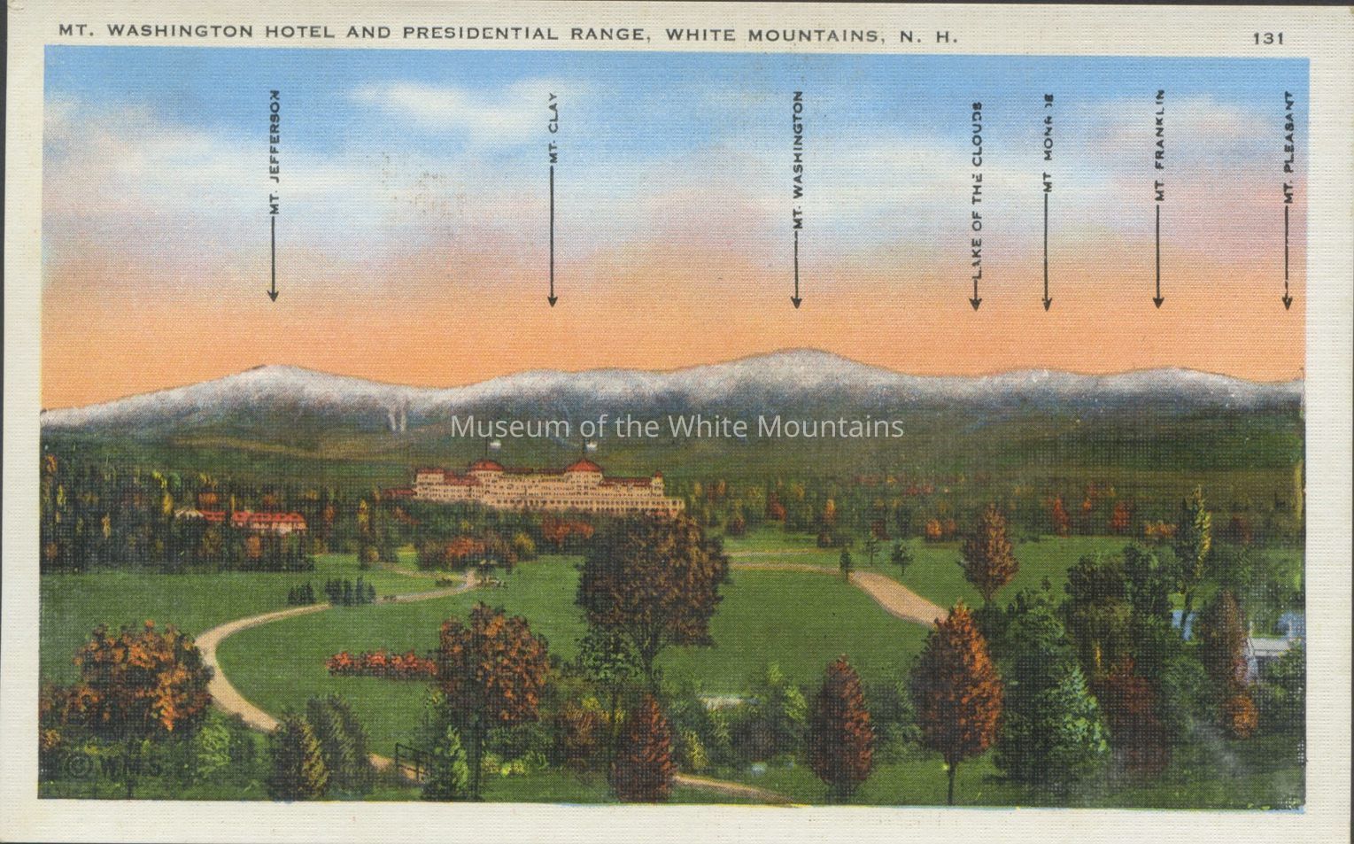 Mount Washington Hotel (Coos county, New Hampshire : inhabited place), Bretton Woods (Coos county, New Hampshire : inhabited place), Washington, Mount (Coos county, New Hampshire : mountain), Presidential Range (Coos county, New Hampshire : ridge), Jefferson, Mount (Coos county, New Hampshire : peak), Clay, Mount (Coos county, New Hampshire : peak), Lakes of the Clouds (Coos county, New Hampshire : lake), Monroe, Mount (Coos county, New Hampshire : peak), Franklin, Mount (Coos county, New Hampshire : peak), Pleasant, Mount (Coos county, New Hampshire : peak)