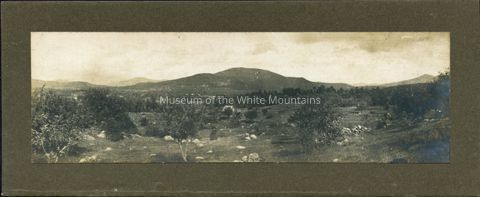 Black and white view of mountains with grass, rocks, and trees in the foreground. A small building is visible in the clearing. Resembles the hills in West Campton from Plymouth.